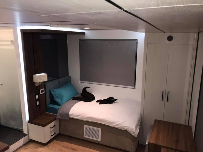 У кожній каюті є регульований кондиціонер, секції для зберігання багажу, дзеркала, тумбочки; у ванній кімнаті є душова кабіна, рушники та халати, забезпечена безперебійна подача гарячої та холодної води.